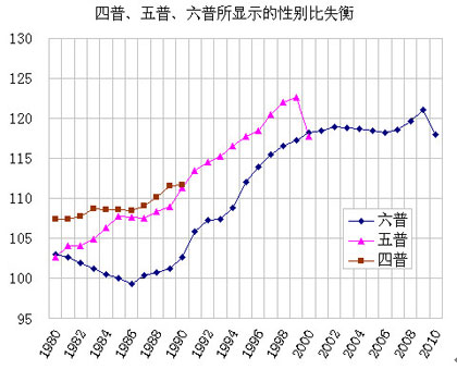 正常的性别比是103~107(以女孩为100),四普、五普和历年来的人口抽查表明,中国从1980年开始实施一胎政策时就开始性别比失衡,而且失衡程度呈持续上升趋势。但六普数据却显示1980~1990年平均性别比仅为101.26,比正常水平低很多,其中1986年还反常的低于100,以后性别比失衡也没有五普和历年人口抽查所反映的那么严重。这说明六普存在低估性别比失衡的可能,或者说重报女孩较多。