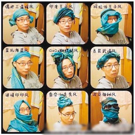 一条围巾有多少种系法?日前微博上的围巾哥用自己的另类御寒法给出了答案。别人围巾脖上系,围巾哥的围巾却在头上顶。LadyGaga风、海盗风、韩国风……围巾哥用一条围巾打造出了9种风格迥异、喜感十足的造型,必有一款适合你。