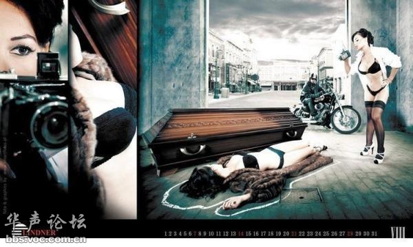 在其中一幅日历照片中,一名年轻女模特靠在一口棺材旁,胸前还盘着一条蛇。在另一幅中,一名穿着深红色紧身衣的女子,正在掏一名躺在一口棺材上的男子的心。