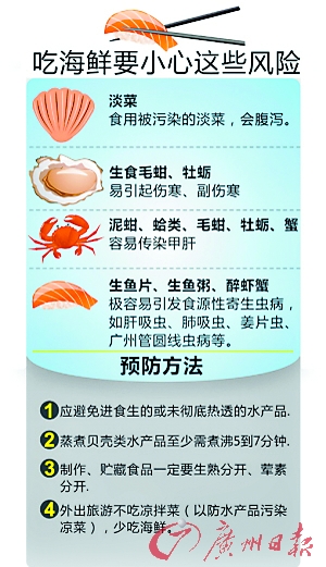 据广州医学院第三附属医院急诊科主任王正维介绍,生吃海鲜容易引发痢疾、霍乱、甲肝等疾病。他提醒市民:“海水里往往带有各种病菌。尤其是浅海区,受污染的程度更明显。”这些病菌会寄生在海洋生物体内,一旦这些受污染的海鲜没有经过处理,直接食用,很有可能会引发疾病。