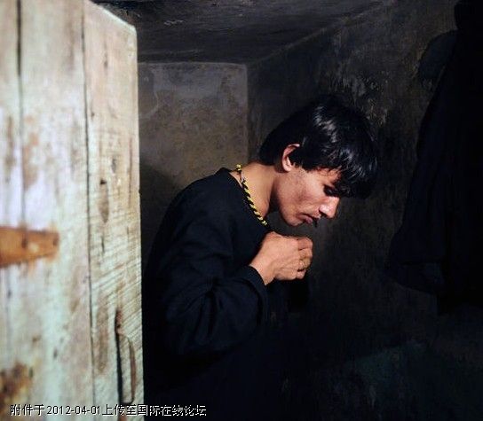 吸食海洛因后,Fridoon从一家茶店的厕所里钻出来。许多当地居民都呼吁要打击这种恶俗,但是效果估计很微,许多豢养男童的人都是当地有权有势、拥有武装的游击队前指挥官,而阿富汗北部的警察及安全部门,都坚称他们已经尽力去抓捕那些豢养男童的人物。