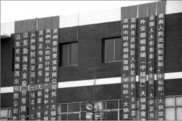 近日,看到一张标语条幅照片,画面是祝贺山东滨州首届滨州“中裕杯”大锅菜烹饪技能竞赛暨第二届大锅菜专委会高峰论坛开幕的。在众多悬挂的祝贺条幅内,竟然还出现了“全国人大”、“最高人民法院”、“外交部”的祝贺条幅。