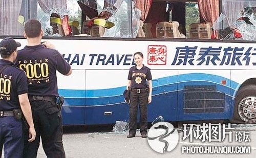 2010年8月,这一辆弹痕累累,血迹斑斑的旅游巴士现在仍然是停在原处。在劫持事件当中遇难的香港人的家属来到了现场,在现场举行了路祭,场面是令人动容。但是,与此同时,巴士竟然会被人当成了观光一个景色。菲律宾的女警在现场拍照留念,脸上带着笑容,好像在他们的身后是什么著名景点似的。