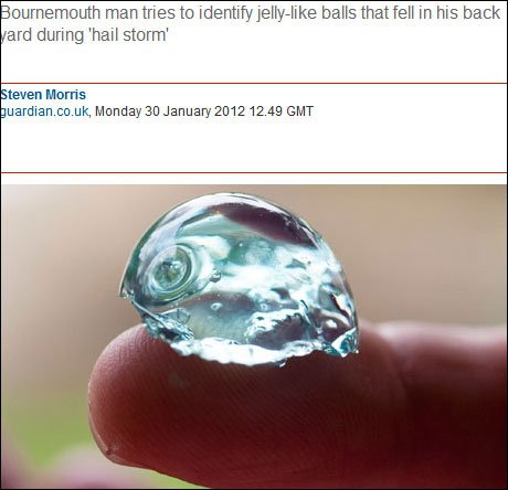 据英国《卫报》30日报道,英国多塞特郡伯恩茅斯(Bournemouth)61岁老人史蒂夫霍恩斯比(Steve Hornsby)在26日遭遇到一件新鲜事,他家后院突然天降奇雨,雨点除了普通的冰雹之外,还夹杂有大量弹珠般的果冻状蓝色小球。