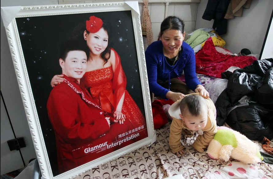 怕被儿子摔坏婚纱照,平时都不敢把婚纱照拿到这里摆放,不过他还是很兴奋地向记者展示当年的美照。