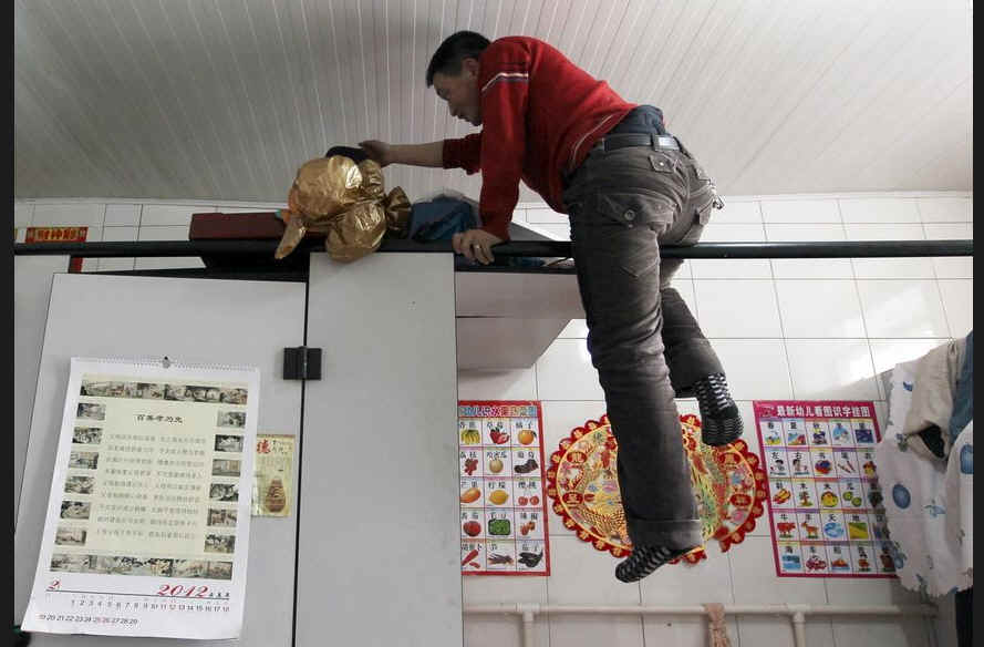 屋子空间狭小,有些物品只能摆放到带蹲位的厕所内,有时曾令军要借着支撑杆爬上去取东西。