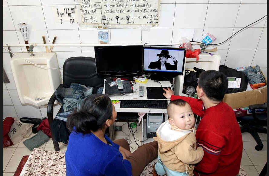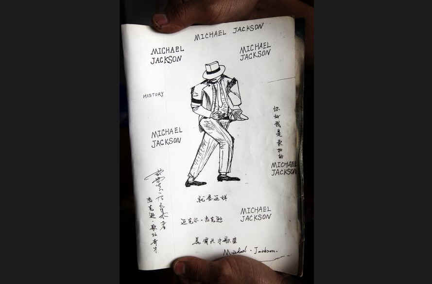 伴随着音乐,曾令军给儿子看自己偶像杰克逊的照片。