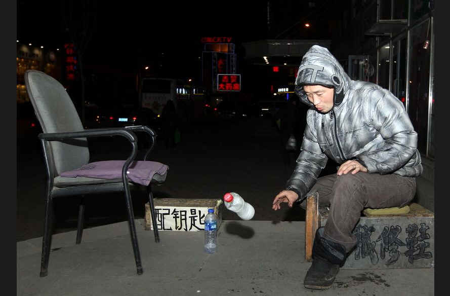 曾令军收鞋摊的时间不固定,只要有顾客预约他都会坐在那里等待。他有个自娱自乐的小“爱好”,将冻了冰的瓶子旋转抛向空中,每当直立在地他都很兴奋。