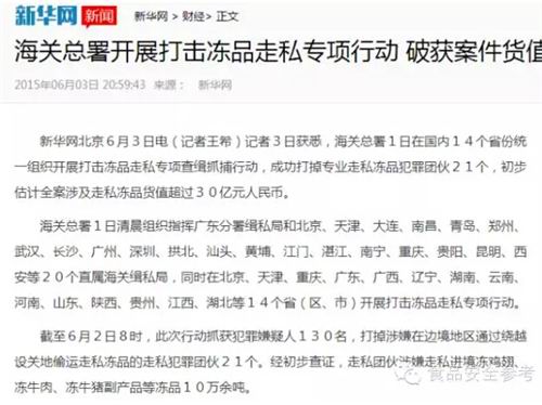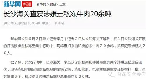 6月2日,新华网(长沙)以“长沙海关查获涉嫌走私冻牛肉20余吨”为题进行报道。作为官媒进行了报道,很正常嘛。