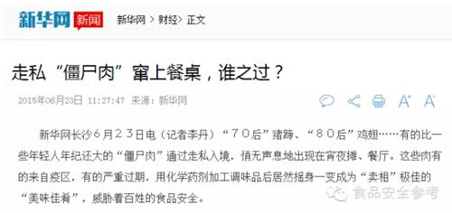 转折点来了,6月23日,新华网(长沙)发表了一篇标题为“走私“僵尸肉”窜上餐桌,谁之过?”的报道,访报道算是对长沙海关破获的案件的深入报道。
