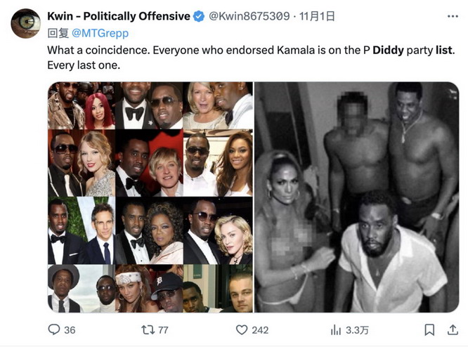 严谨来说,这件事并不是在.10.月发生的,但他确实影响了这次选举的走向。好莱坞本就是民主党大本营,Diddy.又是好莱坞的核心圈人物。他曾经在推特上公开呼吁过.“让特朗普下台”,还试图成立一个黑人政党.“OurBlackParty”。