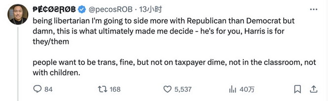在这场两害相权取其轻的选举中,普通人似乎更厌倦的是民主党这些年推行的.“性别多元化”.理念。正如特朗普的宣传语所说:“哈里斯为了.they/them,而特朗普只是为了你”。