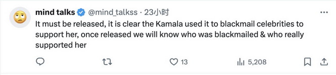 许多网友分析推导出了其中的利益关系:那些支持民主党的明星,可能被一场沸沸扬扬的丑闻拿捏了命根子。