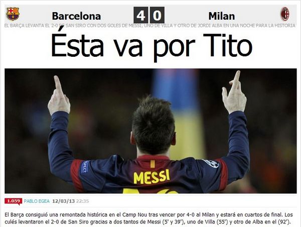 整场比赛,梅西成为了巴萨真正的核心,而AC米兰的球员几乎难以阻挡梅西的前进。第49分钟,安布罗西尼踢倒梅西吃到黄牌,仅仅4分钟后,梅克斯也放倒了梅西。但即便如此,梅西用一次次犀利的突破蚕食着米兰的最后一丝信心。当比利亚下场时,他轻吻了梅西;当终场哨响时,皮克拥抱了阿根廷人。因为在这一刻,是梅西拯救了巴萨,并将巴萨带回宇宙。